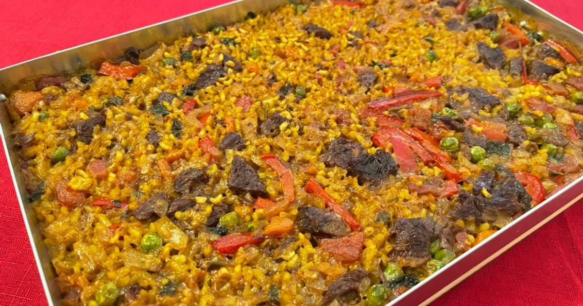 - Montar en la llauna: En la bandeja de horno (preferentemente de hojalata o acero), repartir el arroz crudo. Añadir el sofrito y la carne encima. Cubrir con el caldo caliente (2 partes de caldo por 1 de arroz, aunque puede ajustarse según el horno).
